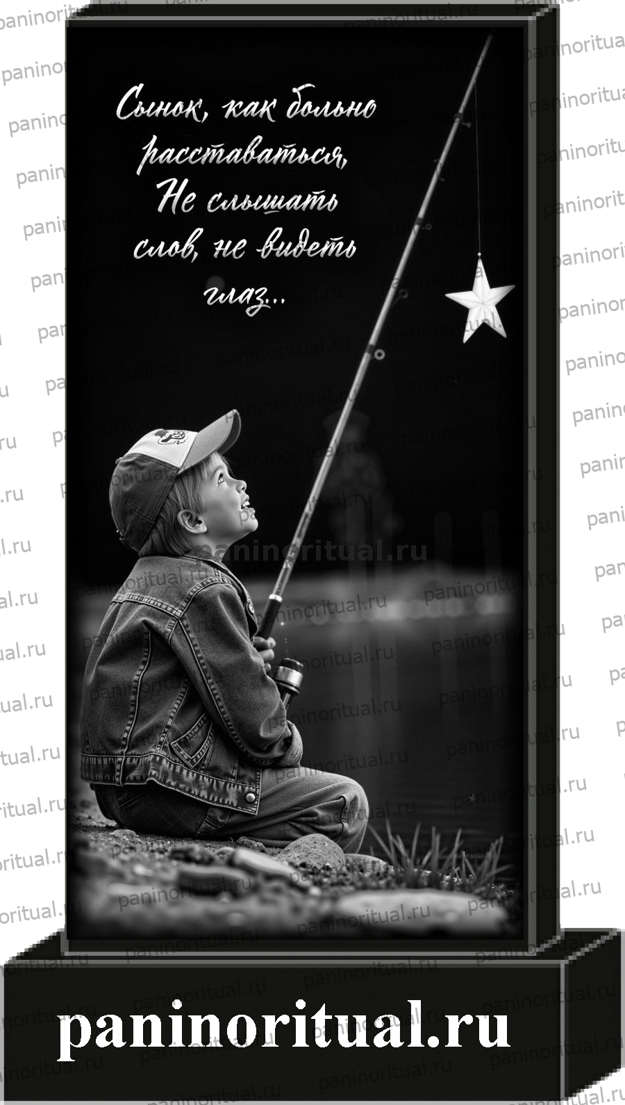 Классический гранитный прямоугольный памятник с художественным оформлением. На надгробие нанесено изображением мальчика с удочкой на фоне звездного неба и трогательная надпись "