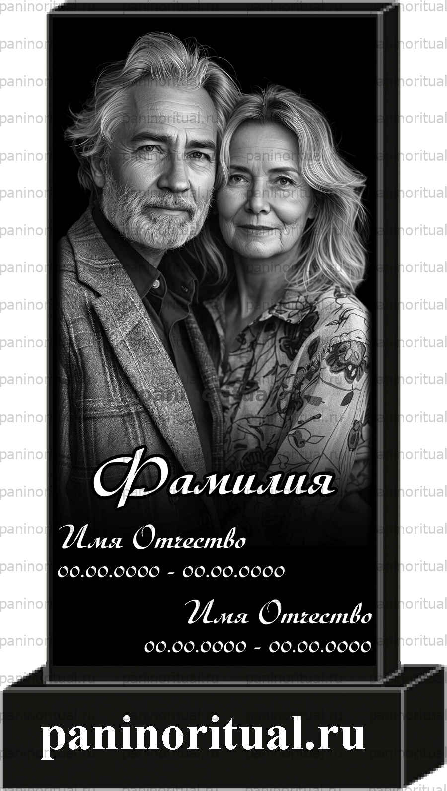 Типовой гранитный памятник, включает в себя комплект из стелы, тумбы и цветника. При необходимости мы можем предложить двойной цветник, а также надгробную плиту размером в ⅓, ⅔ или полноразмерную.