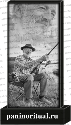 Классический гранитный прямоугольный памятник с художественным оформлением. На надгробие нанесена гармоничная композиция на фоне природного пейзажа с изображением собаки и охотника стреляющего из ружья в уток.