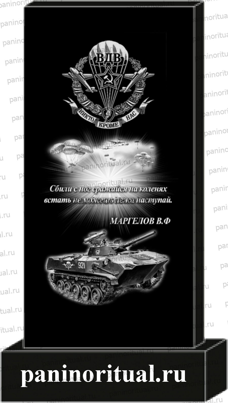 Классический гранитный прямоугольный памятник с художественным оформлением. Чтобы сохранить память о наших героях, чей подвиг будет жить в наших сердцах вечно - на надгробие нанесена гармоничная композиция с боевыми действиями и военной символикой, изображение, которое сочетает в себе достоинство, уважение и историческую ценность. Оформление подойдет на памятник военному ВДВ ветерану - это особый способ выразить уважение и благодарность человеку, отдавшему свою жизнь защите Отечества.