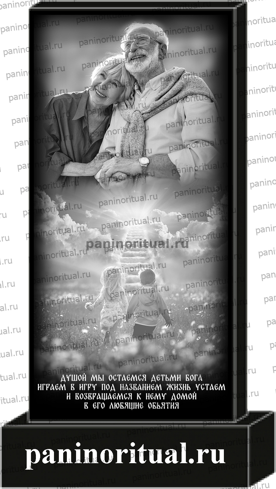 Классический гранитный прямоугольный памятник с художественным оформлением. На надгробие нанесена гармоничная композиция с изображением счастливой пары, обнявшихся мужчину и женщину, которые с небес смотрят на свои детские образы. И эпитафия "Душой мы остаемся детьми Бога. Играем в игру под названием жизнь. Устаем и возвращаемся к нему домой, в его любящие объятия".