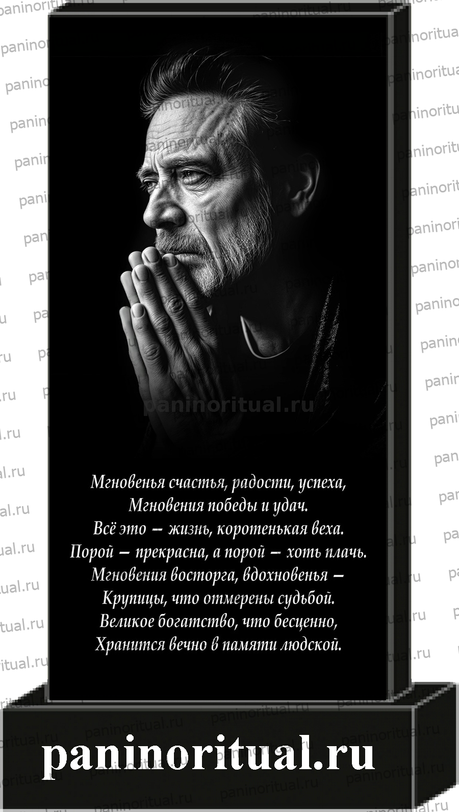 Классический гранитный прямоугольный памятник с художественным оформлением. На надгробие нанесен портрет задумчивого мужчины и эпитафия "Мгновенья счастья, радости, успеха, мгновения победы и удач. Все это - жизнь, коротенькая веха. Порой - прекрасна, а порой - хоть плачь. Мгновения восторга, вдохновения - крупицы, что отмерены судьбой. Великое богатство, что бесценно, хранится вечно в памяти людской."