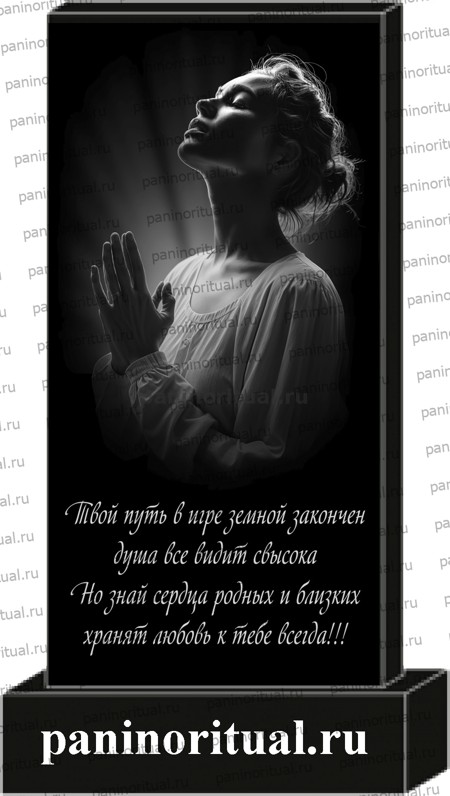 Классический гранитный прямоугольный памятник с художественным оформлением. На надгробие нанесено изображение молящейся девушки и эпитафия "Твой путь в игре земной закончен, душа все видит свысока. Но знай, сердца родных и близких хранят любовт к тебе всегда..."
