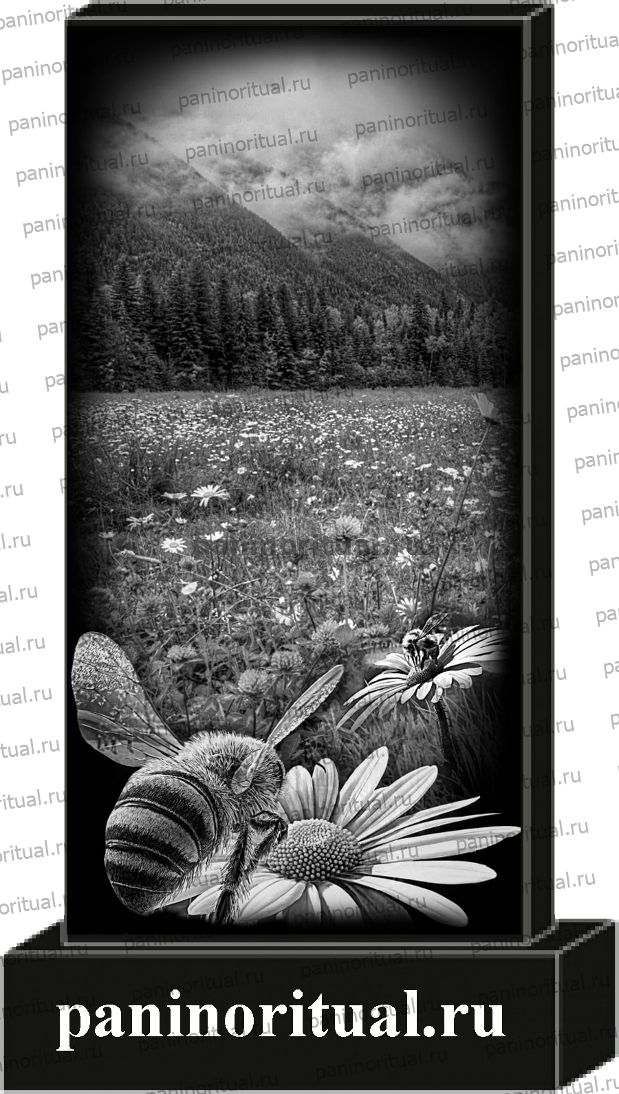 Классический гранитный прямоугольный памятник с художественным оформлением. На надгробие нанесена гармоничная композиция природного пейзажа, на фоне которого изображение пчелы сидящей на цветке.