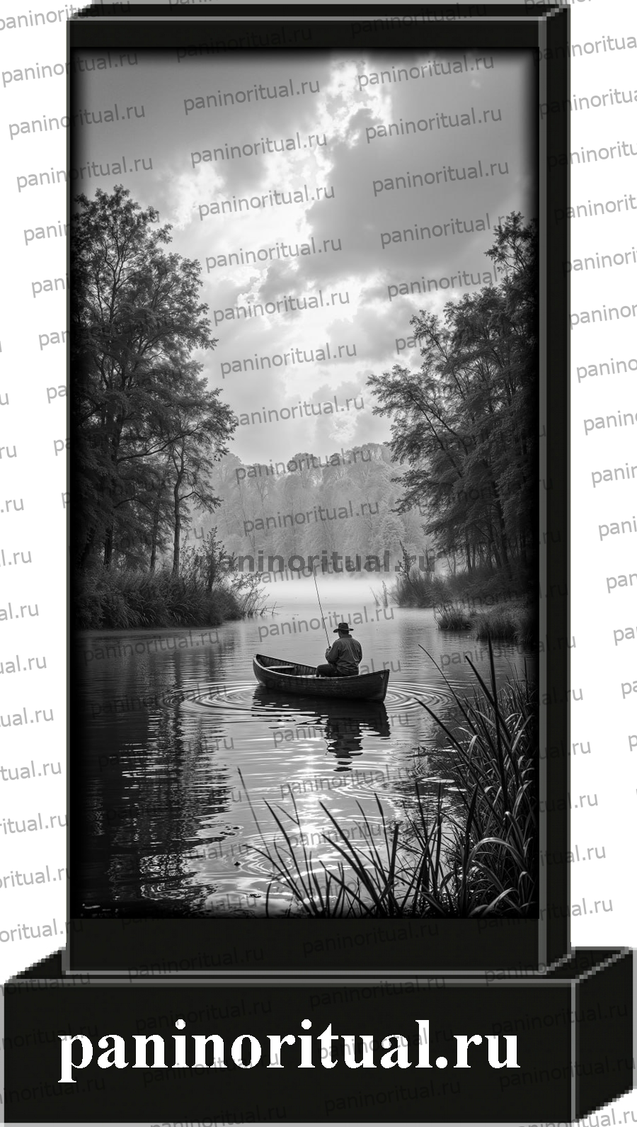 Классический гранитный прямоугольный памятник с художественным оформлением. На надгробие нанесена гармоничная композиция природного пейзажа с изображением человека с удочкой на лодке - ловящего рыбу.