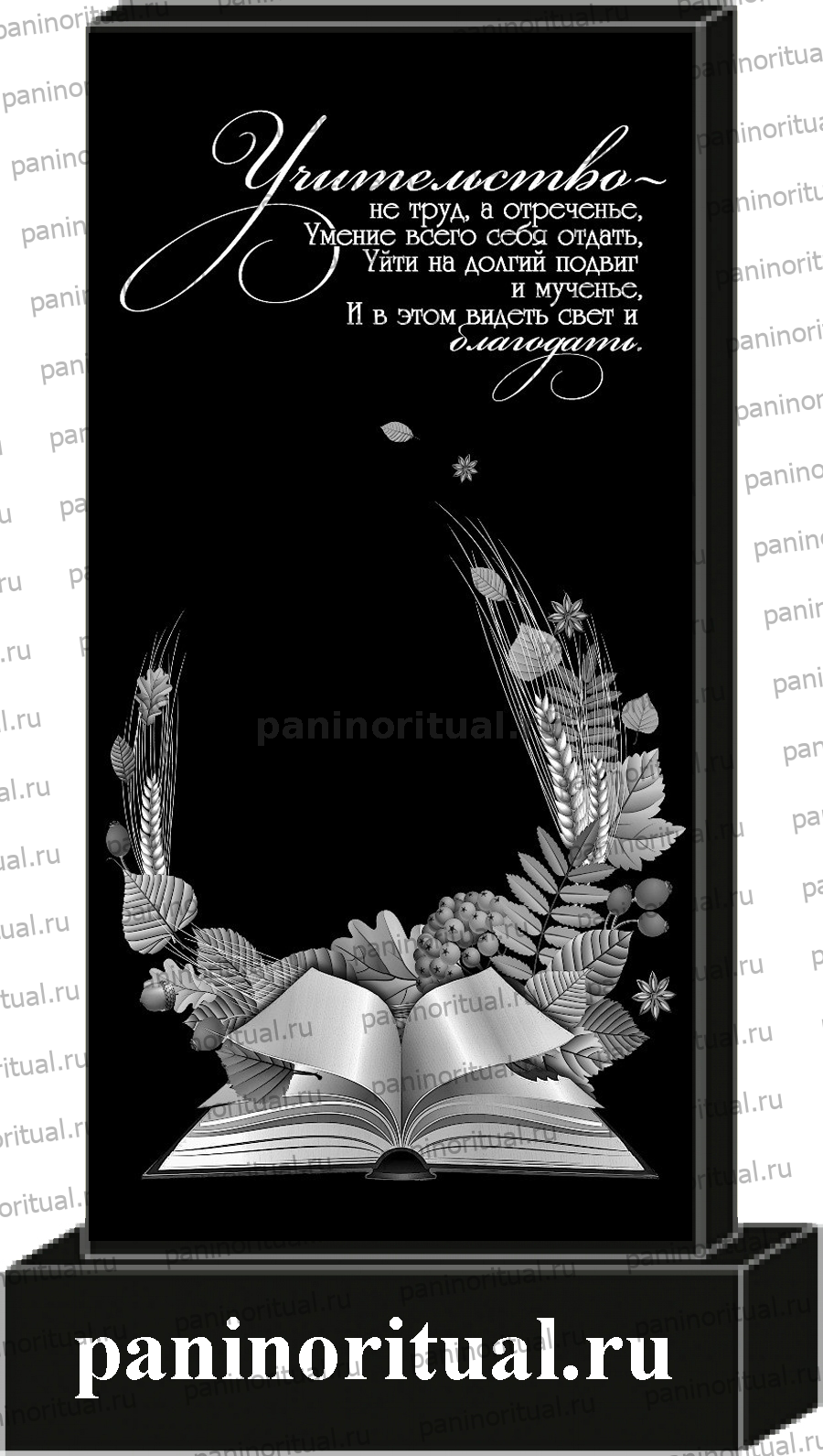 Классический гранитный прямоугольный памятник с художественным оформлением. На надгробие нанесена гармоничная композиция с изображением осенних листьев и раскрытой школьной книги. И надпись "Учительство не труд, а отреченье, умение всего себя отдать, Уйти на долгий подвиг и мученье, и в этом видеть свет и благодать".
