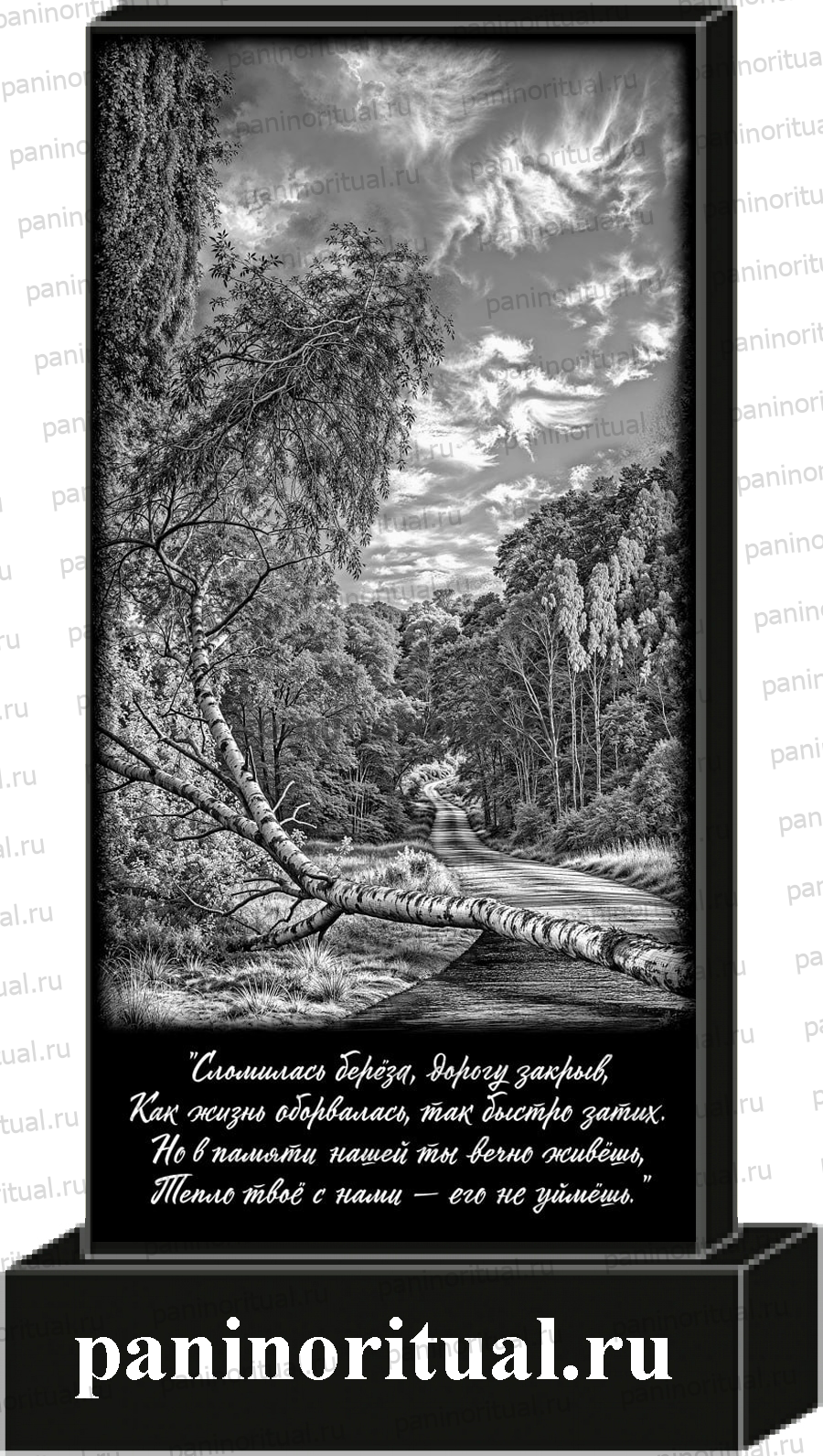 Классический гранитный прямоугольный памятник с художественным оформлением. На надгробие нанесено изображение природного пейзажа со сломанным деревом и эпитафия "Сломилась береза, дорогу закрыв, как жизнь оборвалась, так тихо затих. Но в памяти нашей ты вечно живешь, тепло твоё с нами - его не уймёшь".