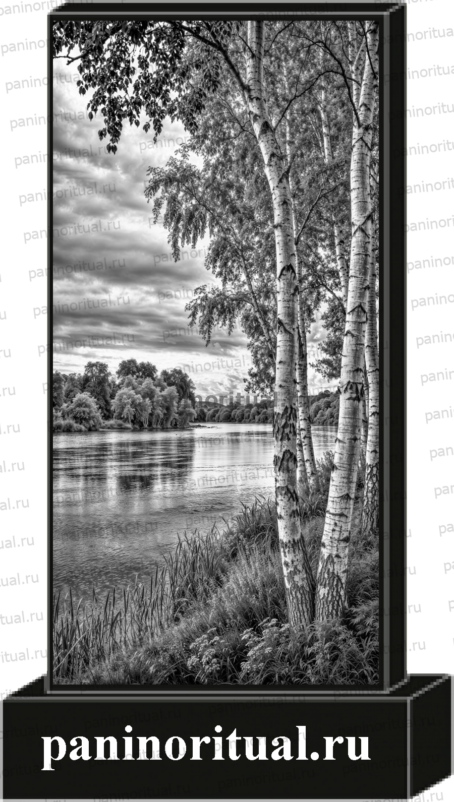 Классический гранитный прямоугольный памятник с художественным оформлением. На надгробие нанесен природный пейзаж с изображением березок у реки.