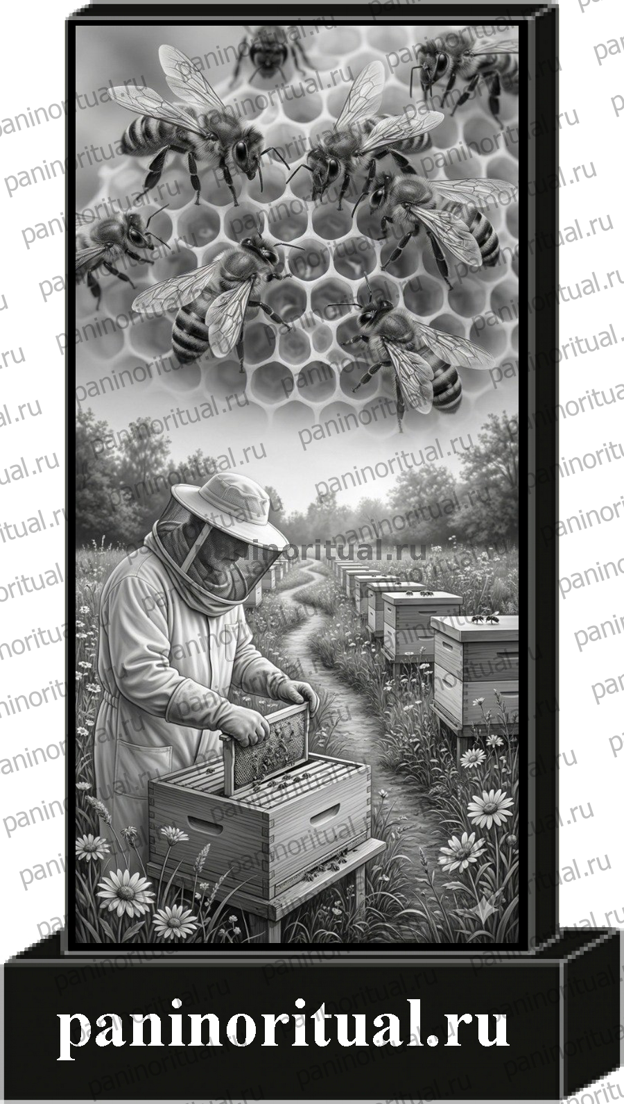 Классический гранитный прямоугольный памятник с художественным оформлением. На надгробие нанесено изображение пчел и пасечника на фоне природного пейзажа с ульями.
