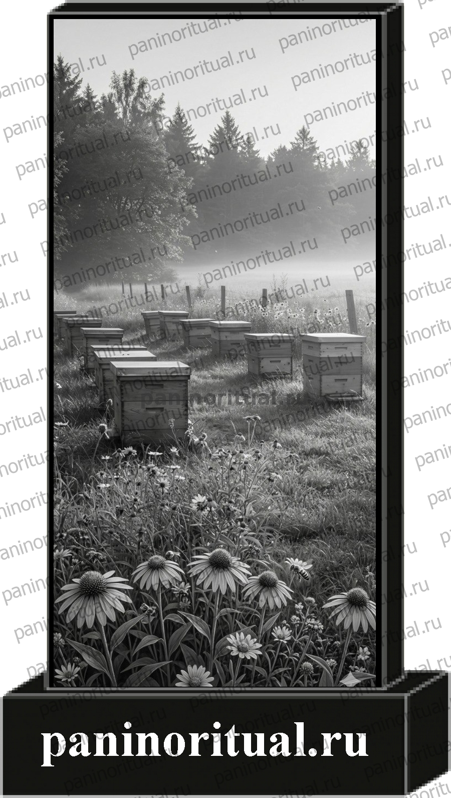 Классический гранитный прямоугольный памятник с художественным оформлением. На надгробие нанесено изображение природного пейзажа с ульями.
