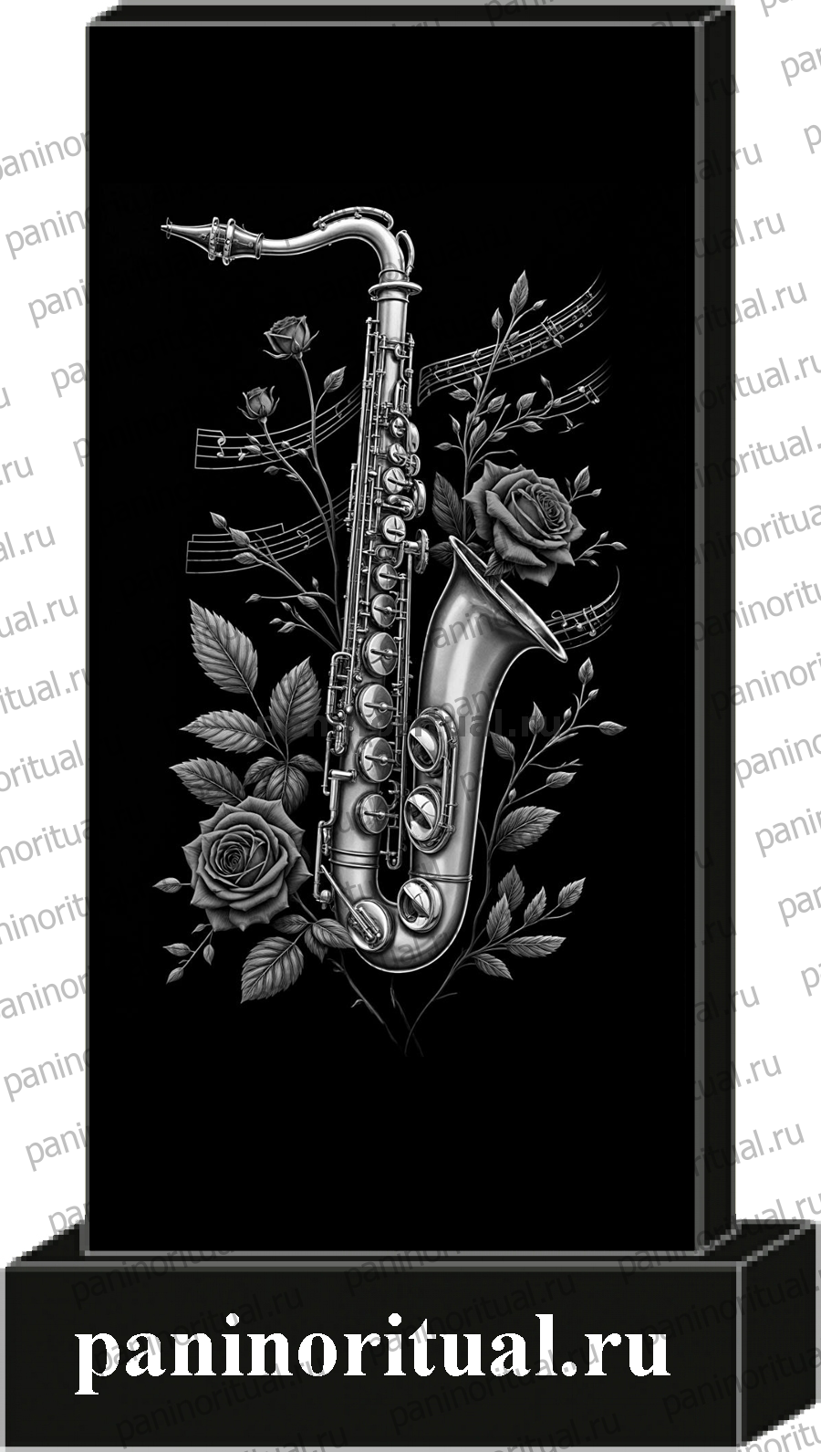 Классический гранитный прямоугольный памятник с художественным оформлением. На надгробие нанесена гармоничная композиция с изображением музыкального инструмента, нот и цветов. Оформление посвящено музыканту, человеку чья жизнь была связана с музыкой.