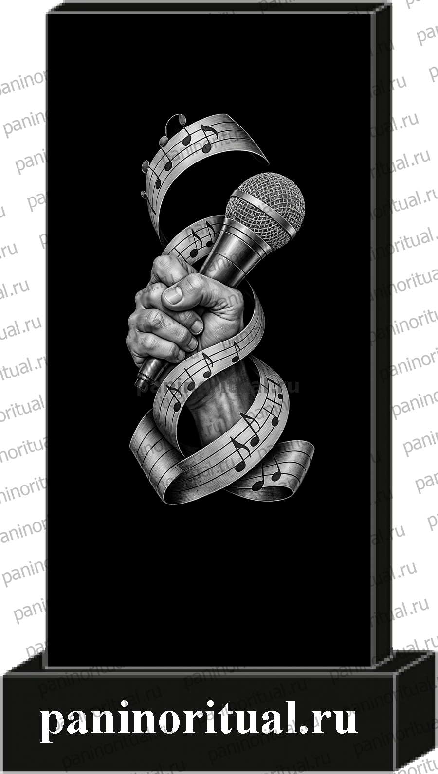 Классический гранитный прямоугольный памятник с художественным оформлением. На надгробие нанесена гармоничная композиция с изображением нот и руки держащей микрофон. Оформление может указывать на музыкальные таланты или профессию усопшего.