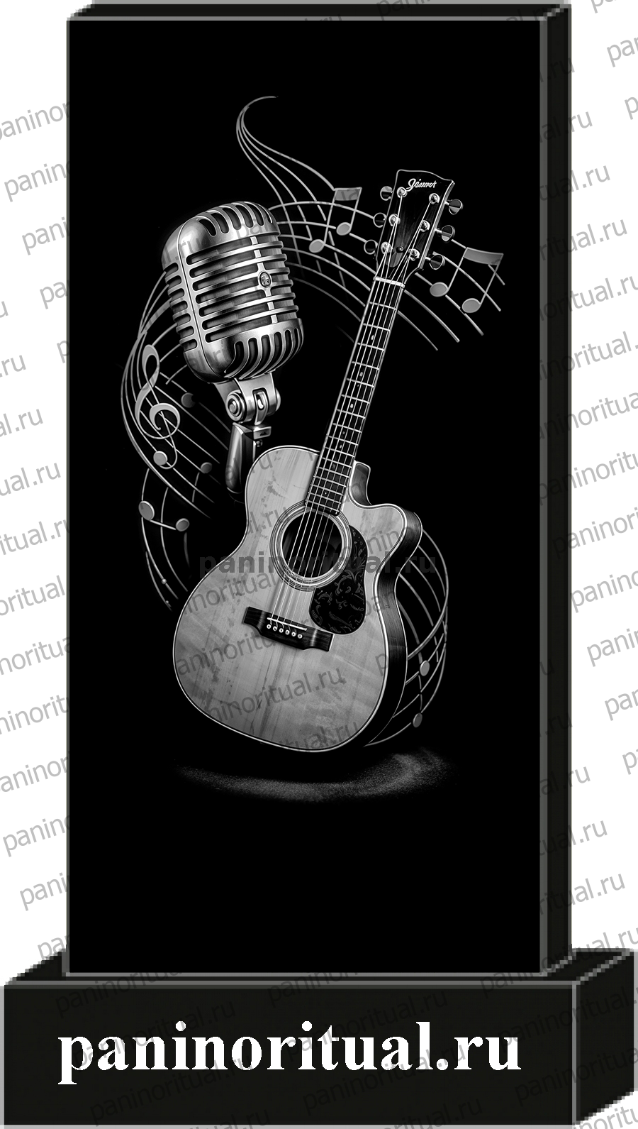 Классический гранитный прямоугольный памятник с художественным оформлением. На надгробие нанесена гармоничная композиция с изображением гитары, нот и микрофона. Оформление как бы рассказывает историю о человеке, для которого гитара была не просто инструментом, но и спутником жизни. Она стала его отражением, его голосом в этом мире.