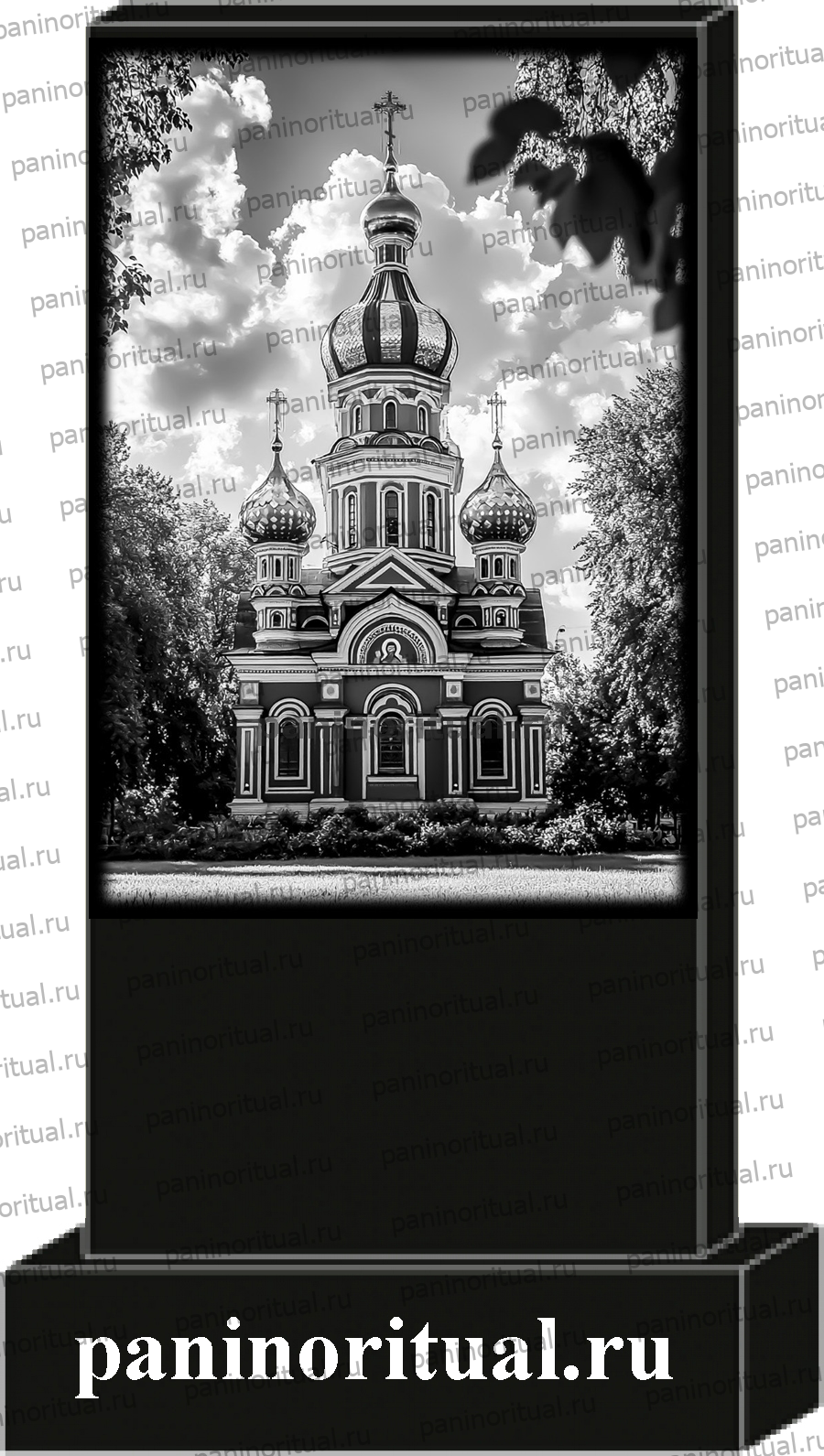 Классический гранитный прямоугольный памятник с художественным оформлением. На надгробие нанесена гармоничная композиция с изображением православного собора.