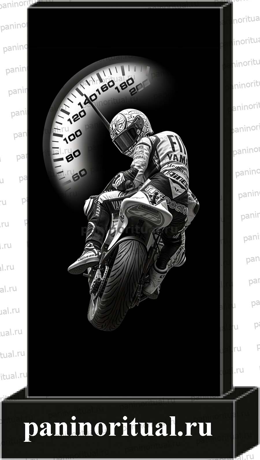 Классический гранитный прямоугольный памятник с художественным оформлением. На надгробие нанесено изображение байкера на мотоцыкле. Памятник погибшему мотоциклисту — способ сохранить память о человеке, который любил скорость и свободу.