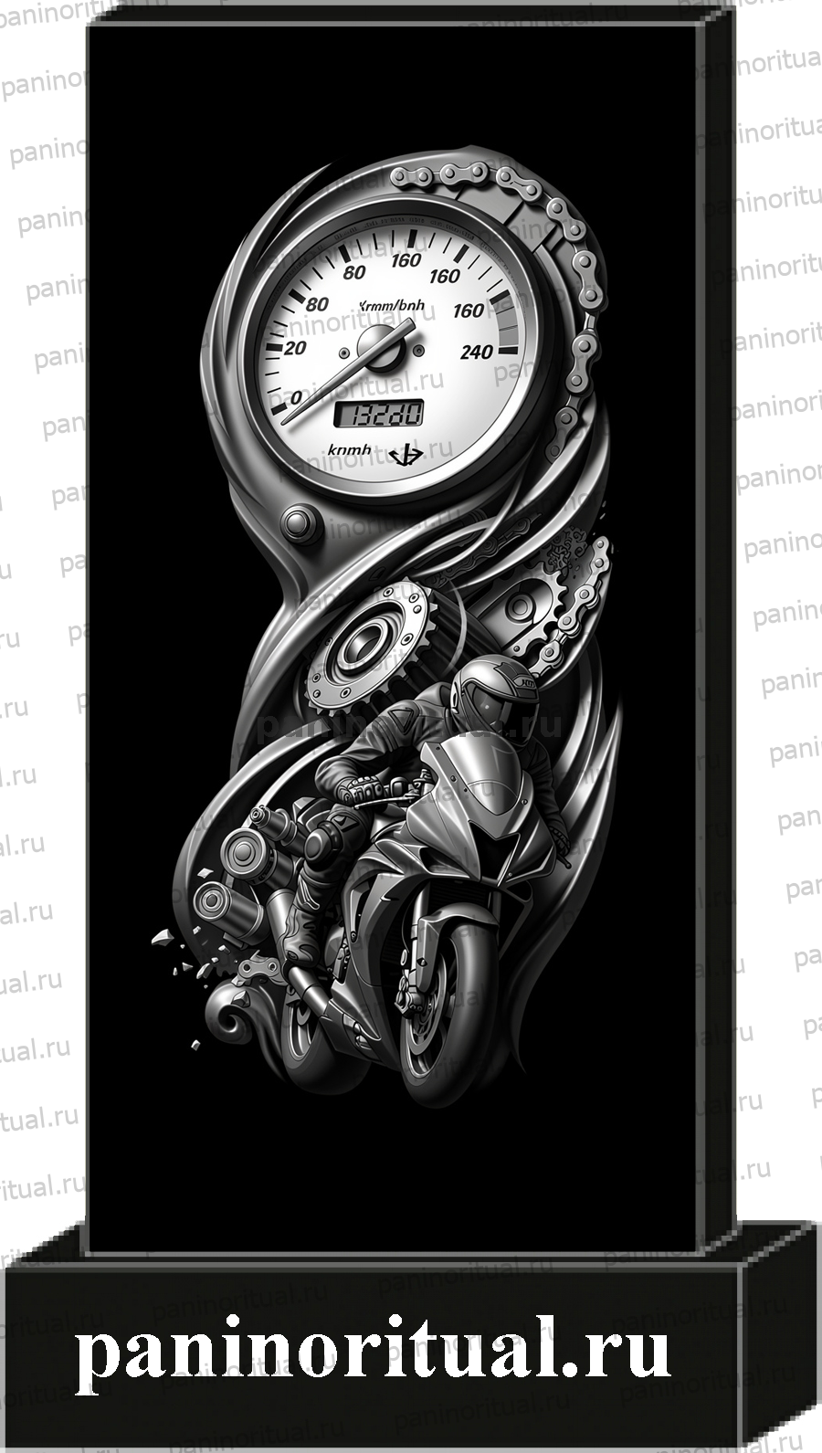Классический гранитный прямоугольный памятник с художественным оформлением. На надгробие нанесена гармоничная композиция с изображением байкера мчащегося на мотоцикле. Оформление посвящено погибшим в аварии байкерам.