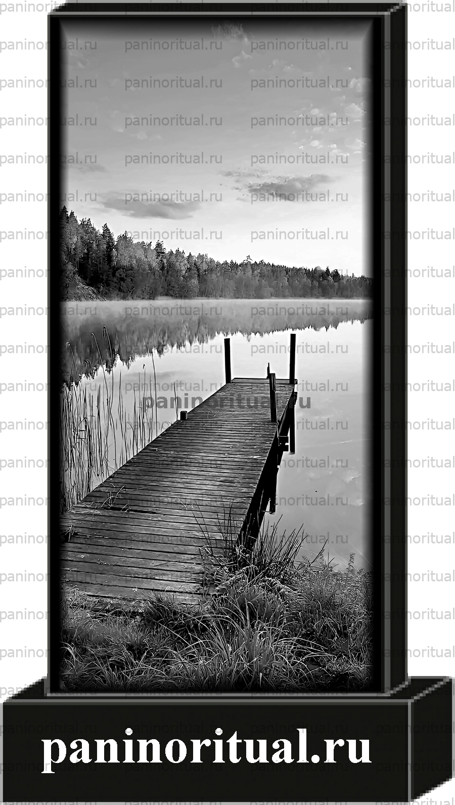 Классический гранитный прямоугольный памятник с художественным оформлением. На надгробие нанесено изображение водоема на фоне природного пейзажа.