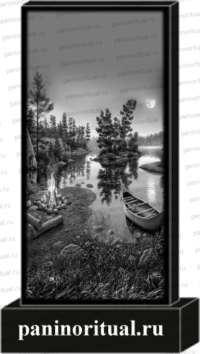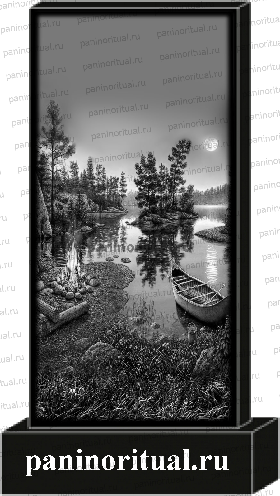 Классический гранитный прямоугольный памятник с художественным оформлением. На надгробие нанесено изображение лодки и костра на фоне природного пейзажа.