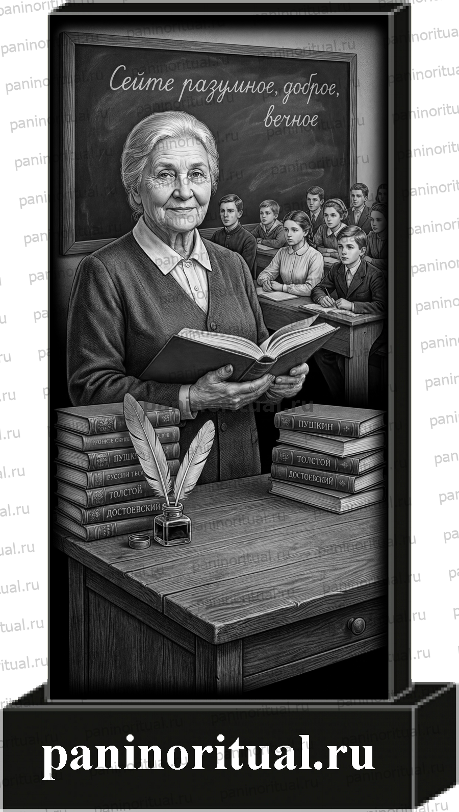 Классический гранитный прямоугольный памятник с художественным оформлением. На надгробие нанесена гармоничная композиция с изображением учителя литературы с книгой в руке и учеников сидящих за школьными партами.