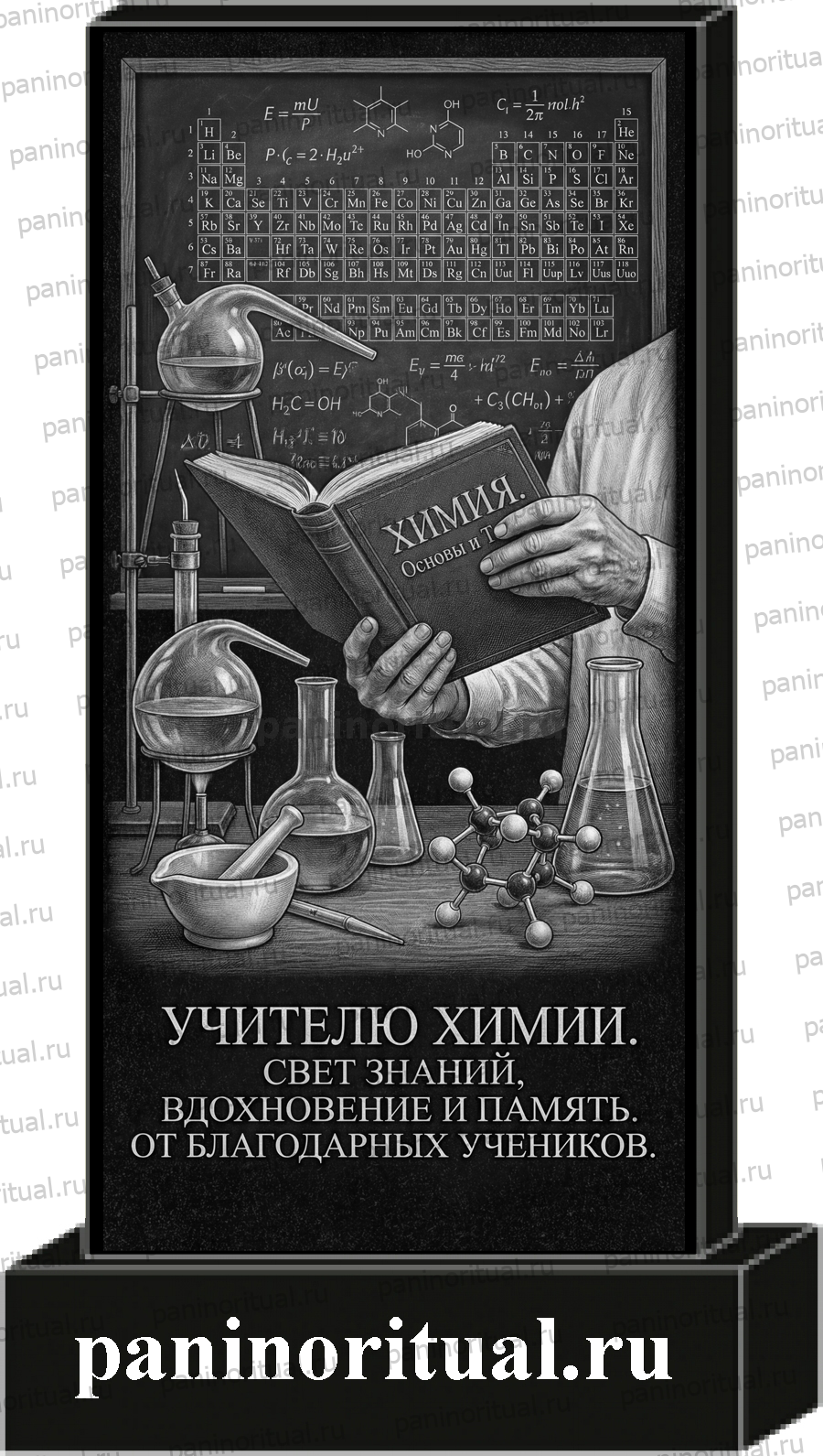 Классический гранитный прямоугольный памятник с художественным оформлением. На надгробие нанесена гармоничная композиция учителю химии с изображением химического лабораторного оборудования, колб, мензурок, пробирок и трогательной надписи "Свет знаний, вдохновение и память от благодарных учеников".
