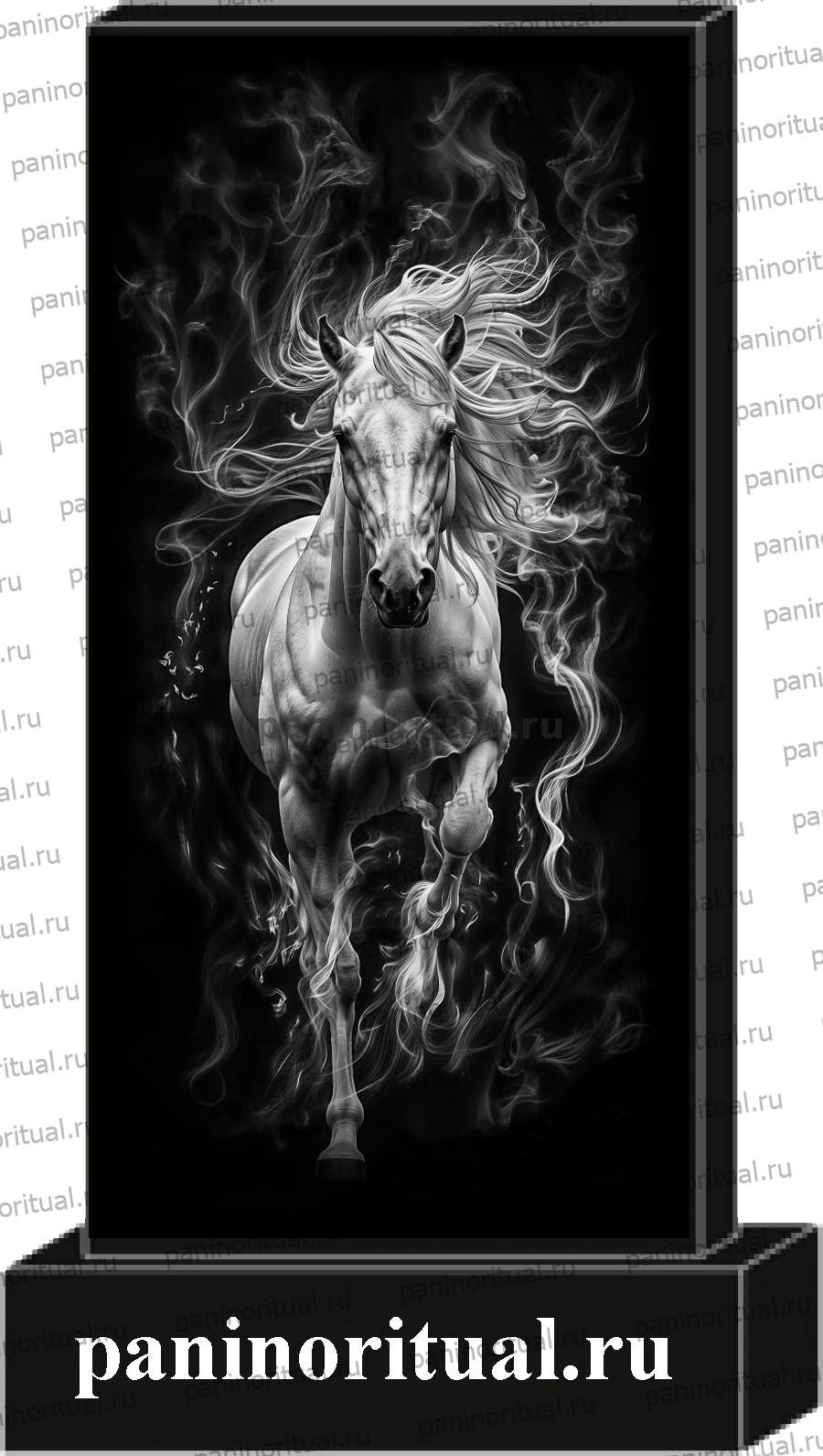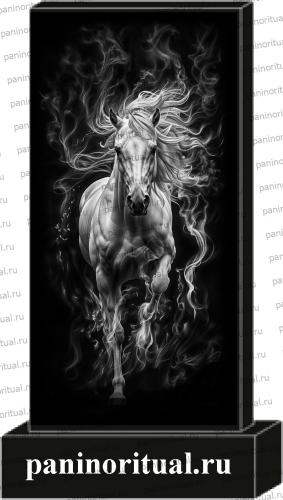 Классический гранитный прямоугольный памятник с художественным оформлением. На надгробие нанесено изображение мчащейся лошадь.