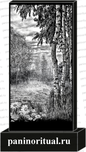 Классический гранитный прямоугольный памятник с художественным оформлением. На надгробие нанесена гармоничная композиция природного пейзажа с изображением берез.