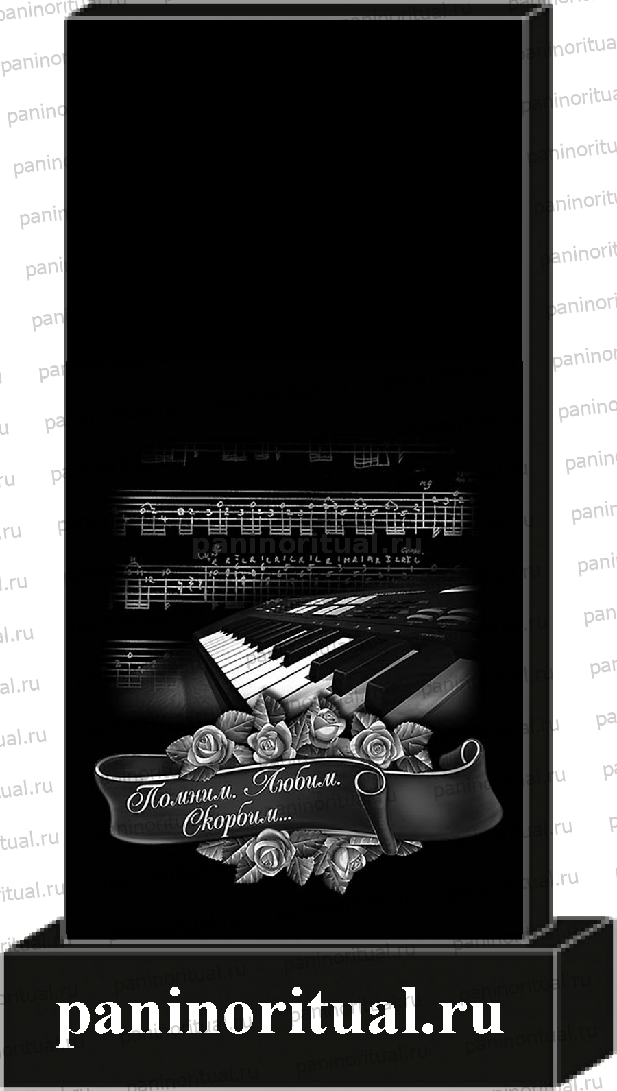 Классический гранитный прямоугольный памятник с художественным оформлением. На надгробие нанесена гармоничная композиция для музыканта - пианиста, с изображением букета роз и траурной ленты на фоне клавиш пианино.