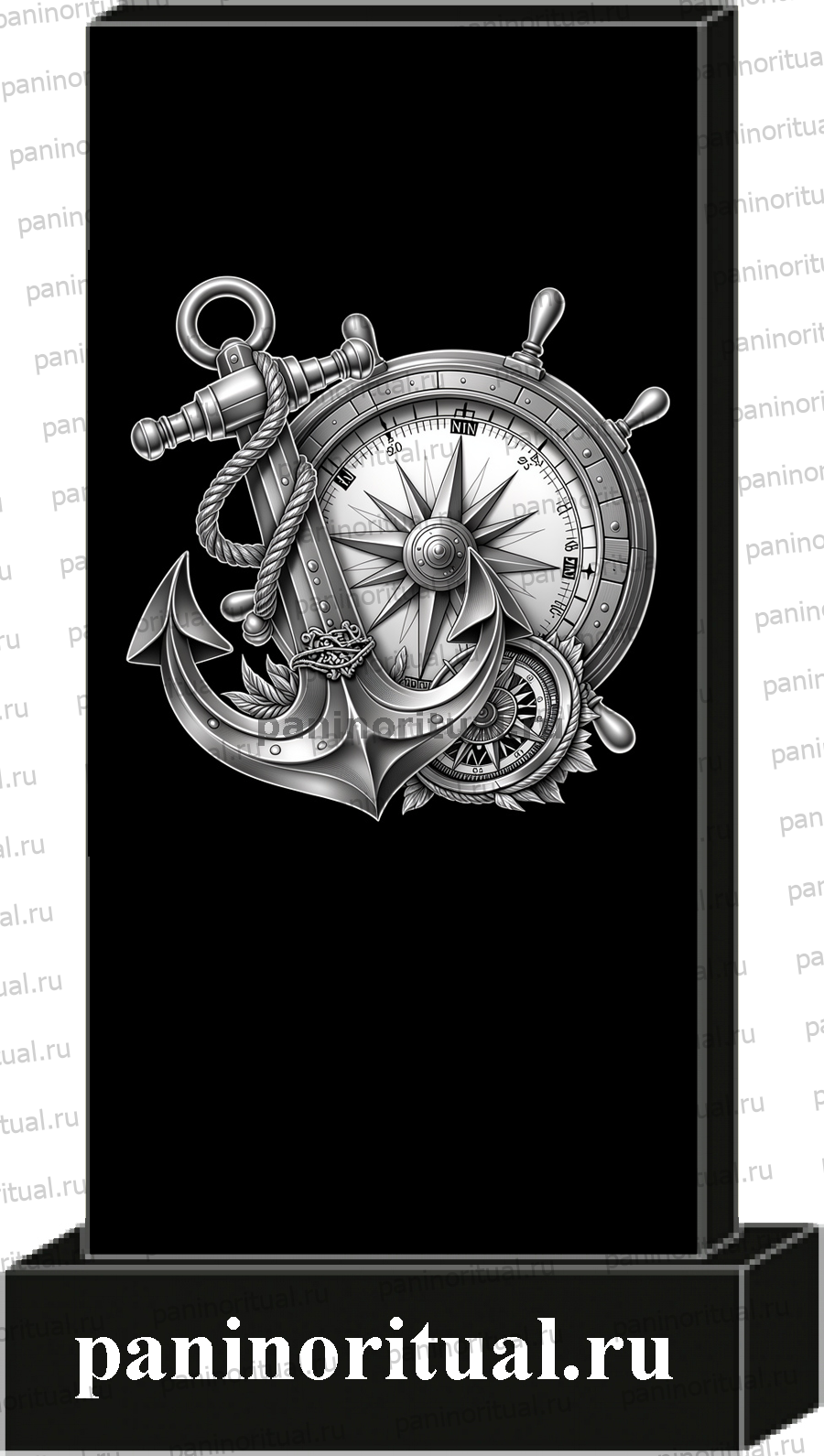 Классический гранитный прямоугольный памятник с художественным оформлением. На надгробие нанесена гармоничная композиция с изображением компаса и морского якоря.