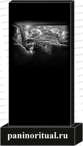 Классический гранитный прямоугольный памятник с художественным оформлением. На надгробие нанесена гармоничная композиция с изображением водителя за рулем автомобиля, который движется по дороге ведущей в небо.
