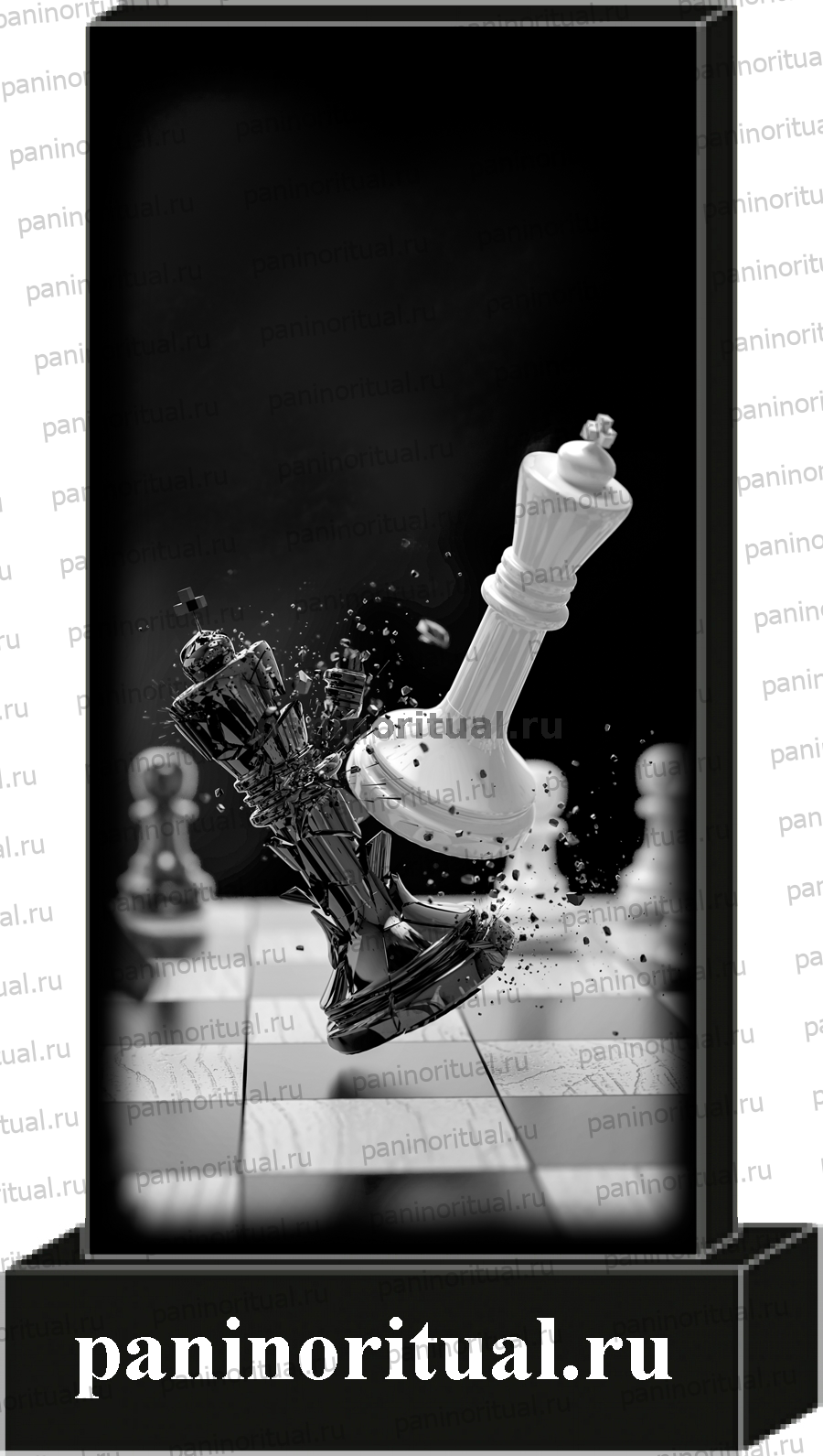 Классический гранитный прямоугольный памятник с художественным оформлением. На надгробие нанесена гармоничная композиция с изображением шахматных фигур расположенных на шахматной доске. Подойдет для шахматиста, человека занимающегося профессиональной игрой в шахматы и для просто любителя играть в шахматы.