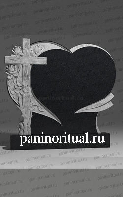 Вертикальный памятник из гранита в форме резного сердца с крестом и розой.