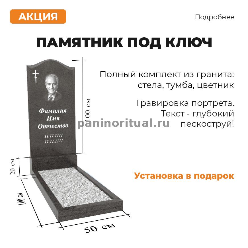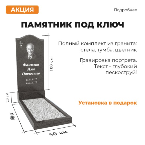 Стандартный комплект: стела, тумба и цветник. Общая высота 120 см. Гравировка портрета. Глубокий пескоструй, который позволяет придать объём и красоту текстовой информации. Для того, что бы получить акцию, звоните и говорите : ‘’ акция под ключ’’.